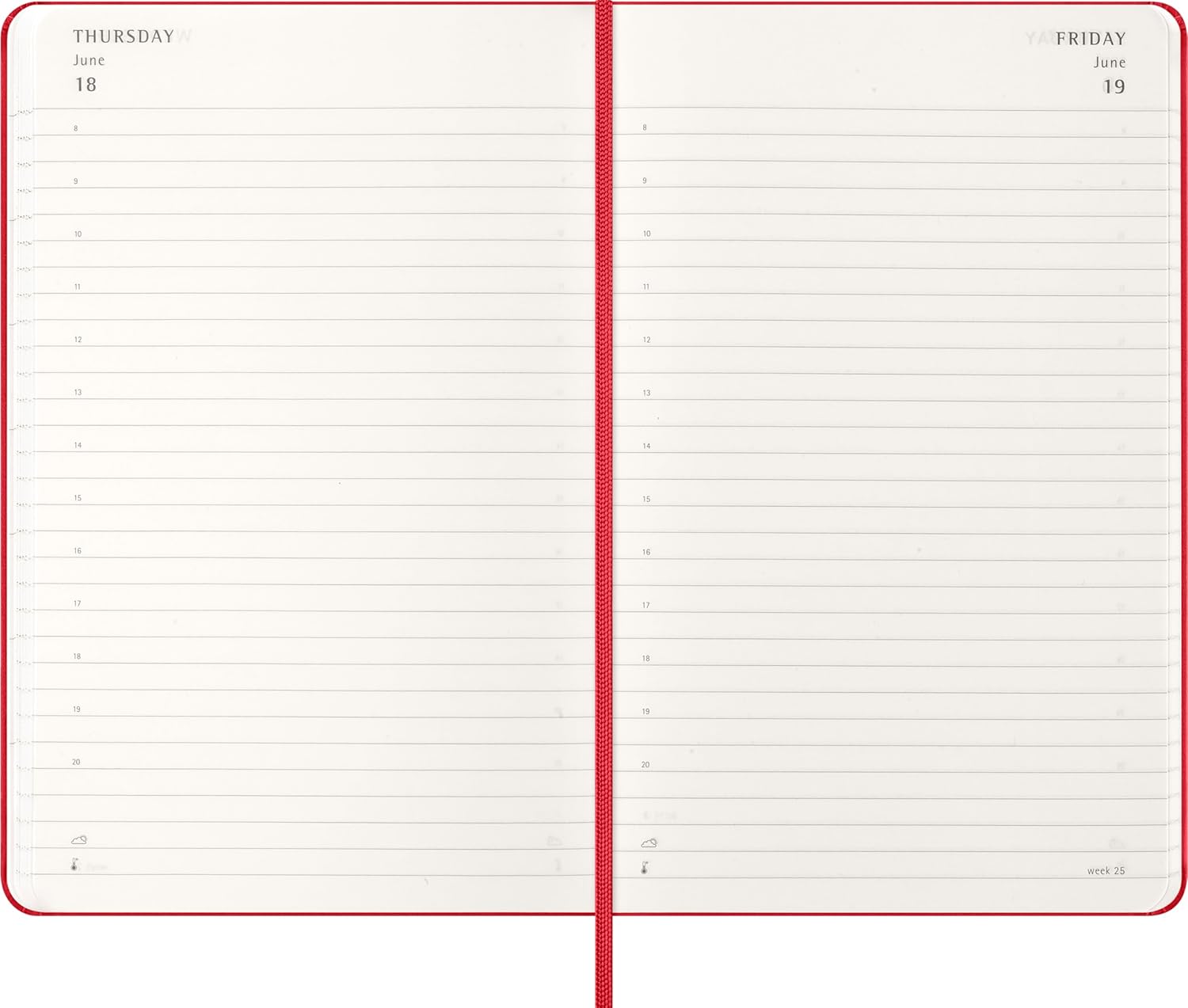 • Твердая обложка красного цвета с закруглёнными углами, эластичной резинкой и встроенной закладкой в тон.