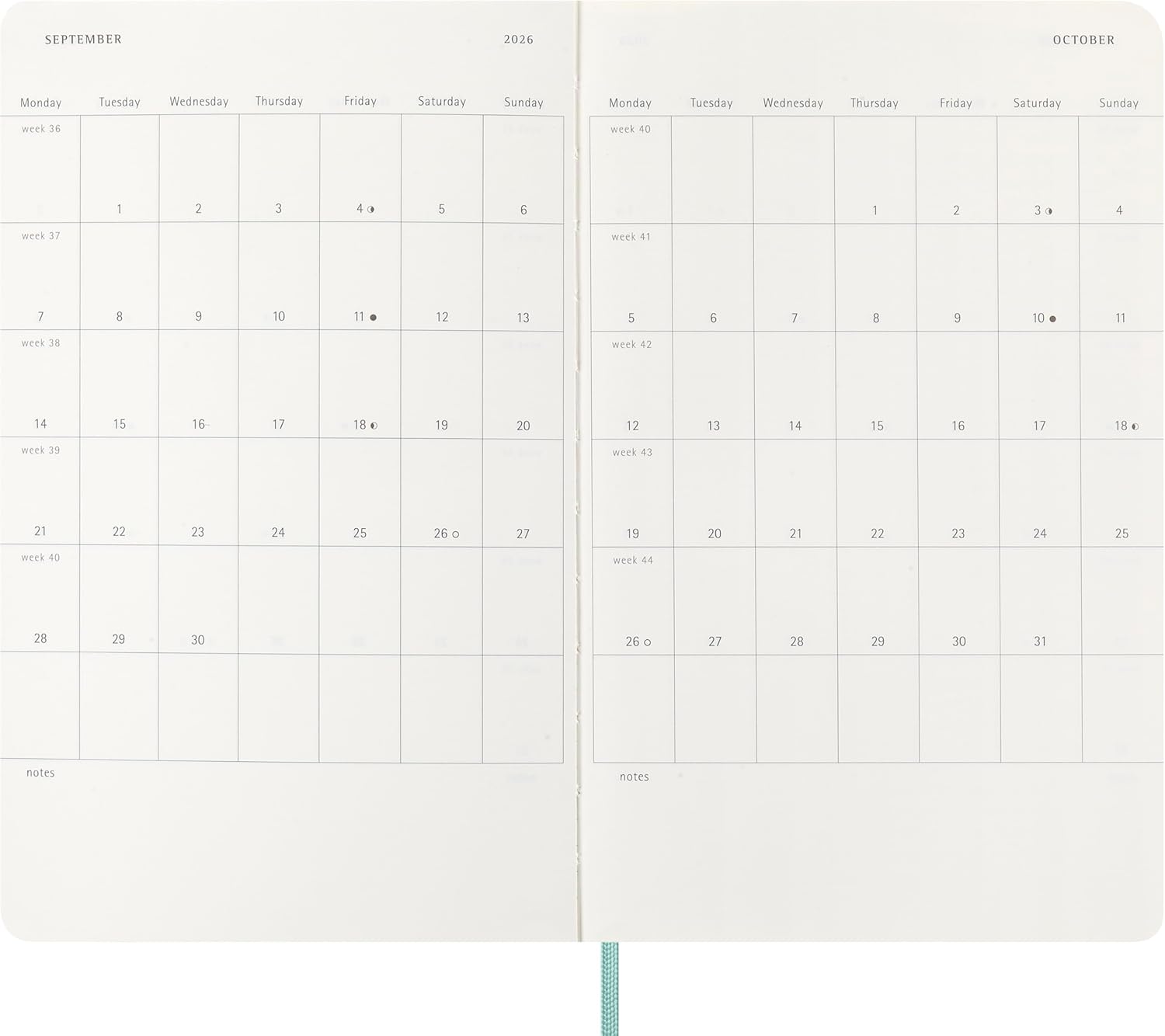 • Это 12-месячный планировщик — с января по декабрь 2026 года — с недельным раскладом на двух разворотах. На левой стороне неделя с местом для задач и напоминаний, на правой стороне просторная линованная область для заметок.